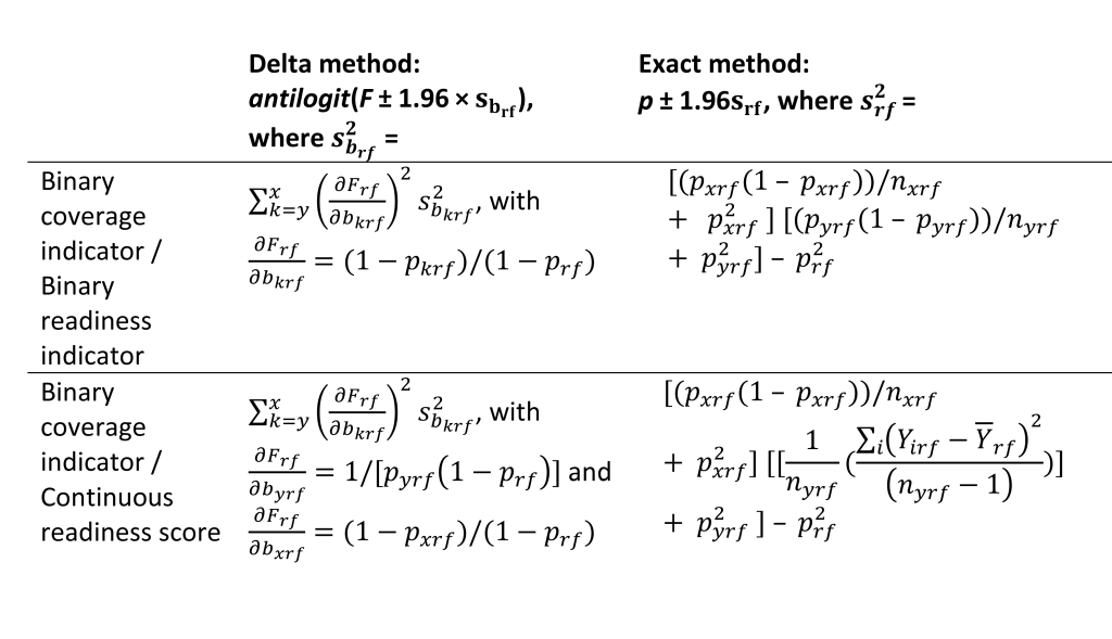In some cases, facility readiness may be a continuous score rather than a binary measure. Figure 1 summarizes the variance calculations for the exact and delta methods in the case of a binary coverage indicator and a binary or a continuous readiness measure. Details of the modifications to the formulas in the case of a continuous readiness measure are shown in Appendix S3 of the Online Supplementary Document.