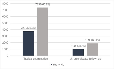The study sample was comprised of 11161 old-aged migrants, and the utilization of EPHS of the participants is illustrated in Figure 1. Approximately66.2% of old-aged migrants did not access to the free annually physical examinations from community health station/center in the past year. Among the 2898 old-aged migrants with chronic diseases, only 34.6% of them have been follow-upped by doctors to monitor their conditions of chronic diseases in the past year of the investigated time.