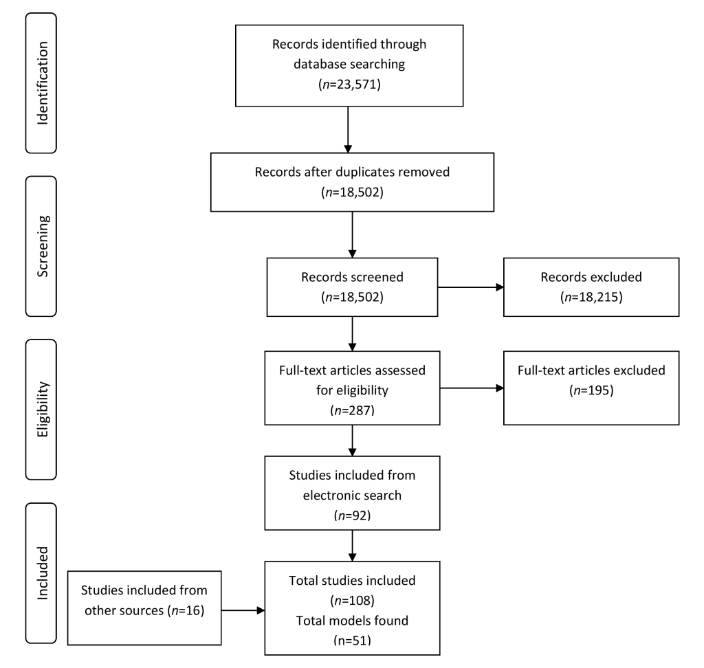 We identified 108 eligible studies, which employed a total of 51 models: 42 models were used to