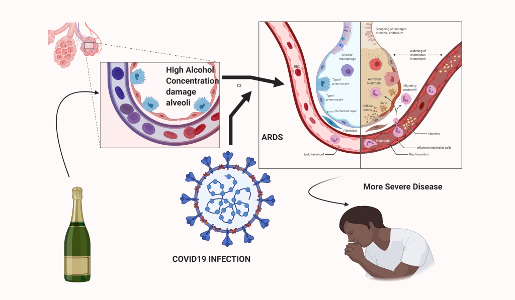 Alcohol gets absorbed via the bronchial circulation directly across the ciliated epithelium of the conducting airways. Vaporization during exhalation is followed by condensation as the air cools the vapors in the trachea eventually leading to a higher concentration of alcohol [8] which modifies airway-epithelium host defenses by altering cytokine release, barrier function, and ciliary function [9]. Alcohol also causes oxidative stress and alterations in alveolar macrophage functions [10]. This alteration in pulmonary defense could enhance the risk of acquiring SARS-Cov-2 infections. Moreover, ARDS is more likely in patients who have an injury to the lung by pathogens including viruses. A recent meta-analysis of 13 observational studies found an association between alcohol consumption and the risk of developing ARDS (1.89; 95% CI = 1.45-2.48) among adults [11]. There appears to be a higher risk of acquiring COVID-19 related ARDS in chronic alcoholics (Figure 1). The World Health Organization (WHO) in its public information factsheet of COVID-19 states that heavy alcohol use increases the risk of ARDS, which is one of the complications of COVID-19. This factsheet was to caution the public regarding alcohol consumption and the fact that it is neither protective nor preventive against COVID-19, a common myth due to its important role in alcohol-based sanitizers for hand hygiene [12]. Alcohol consumption has been somewhat omitted from the perspective of risk factors for the severity of COVID-19 disease.