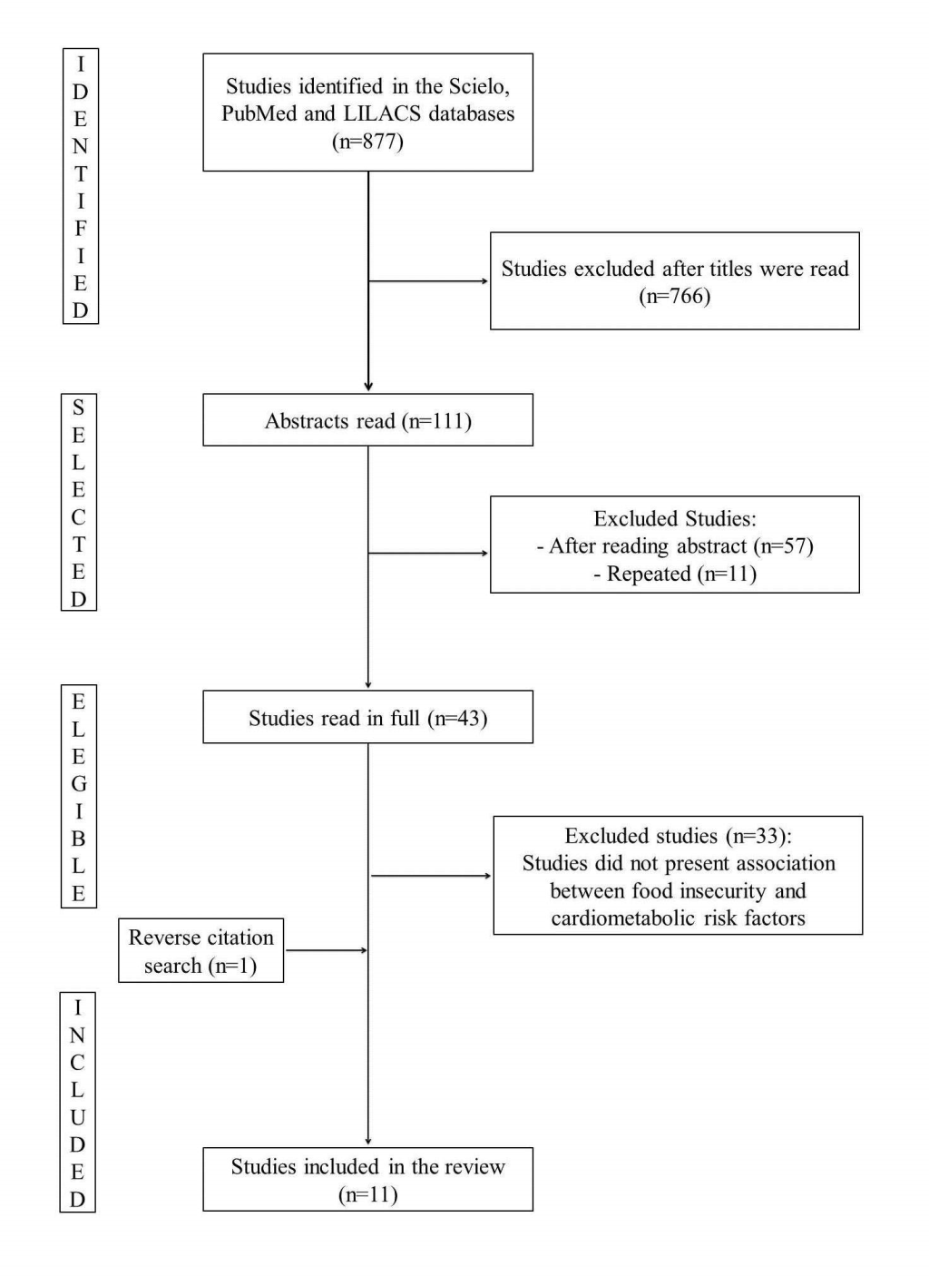 The search terms used were 'food security', 'food insecurity', 'diabetes', 'hypertension', 'metabolic syndrome', 'dyslipidemia', 'stress', 'waist circumference' and ' excess weight'. For the search, we used a combination of 'food security' OR ‘food insecurity’ AND other terms, to refine our search to the topic of interest, the relationship between food insecurity and cardiometabolic risk. The search produced 877 articles, however 766 were excluded after reading the titles. The abstracts of the remaining 111 articles were read. Then, 43 studies were selected for further reading. After reading the articles in full, 10 articles were selected. An additional article was selected after a reverse citation search, totaling 11 articles (Figure 1). The studies were evaluated by STROBE - Strengthening the Reporting of Observational Studies in Epidemiology [15].