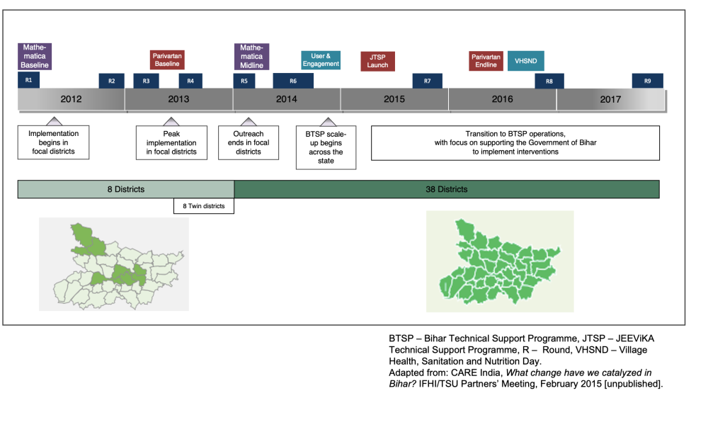 The BMGF and PCI saw an opportunity to scale-up health-layered SHGs across Bihar by adapting and layering the Parivartan model into JEEViKA operations [54,55]. In 2015, the BMGF funded the JEEViKA Technical Support Program (JTSP) led by PCI. Although the JEEViKA program was not health focused at that time, JTSP partnered with the JEEViKA program to create and institutionalise the focus on RMNCHN and sanitation behaviours and in 2015 the $415M program included 11% allocation to RMNCHN. The JTSP led the layering of RMNCHN plus sanitation interventions upon SHGs formed by JEEViKA in 101 blocks across 11 districts, thus leading to a second stage of statewide scale-up beyond the pilot districts. Similar to the BTSP structure, the JTSP program provided technomanagerial support to the GoB’s JEEViKA program at the block and state levels to more effectively manage the JEEViKA scale-up, which included prototyping selected interventions which were subsequently scaled-up via JEEViKA SHGs. The JTSP also incorporated a multi-pronged communication initiative and strategic guidance to the GoB.
