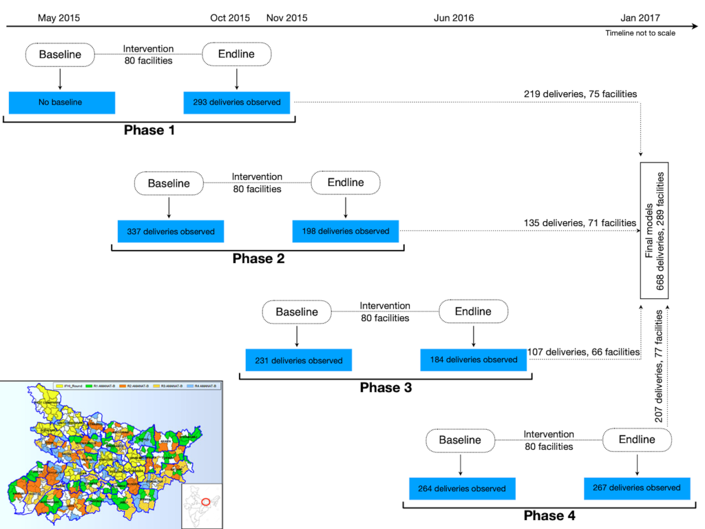 We used data from the DOD and the Facility Information System (FIS), which were CARE-India’s concurrent assessment platform for the Government of Bihar’s AMANAT program. Clinical enumerators visited each facility for a week to observe deliveries occurring between 9 am and 5 pm. Deliveries were included if all three stages of labor were observed by an independent observer, not from admission to discharge. DOD provided comprehensive information on specific evidence-based practice (EBP) indicators for individual deliveries during the pre- and post-intervention periods. FIS was a web-monitoring system gathering data on: patient demographics, delivery information, diagnosis and management of maternal and neonatal complications before and after delivery, along with the discharge or referral information while the intervention was ongoing. FIS also provided training details including date, time and topics covered for each activity, number and type of each simulation conducted and staff attendance for each session. It is likely that the same providers were observed at baseline and endline. However, the data set did not have the ability to match baseline with endline delivery observations by providers.