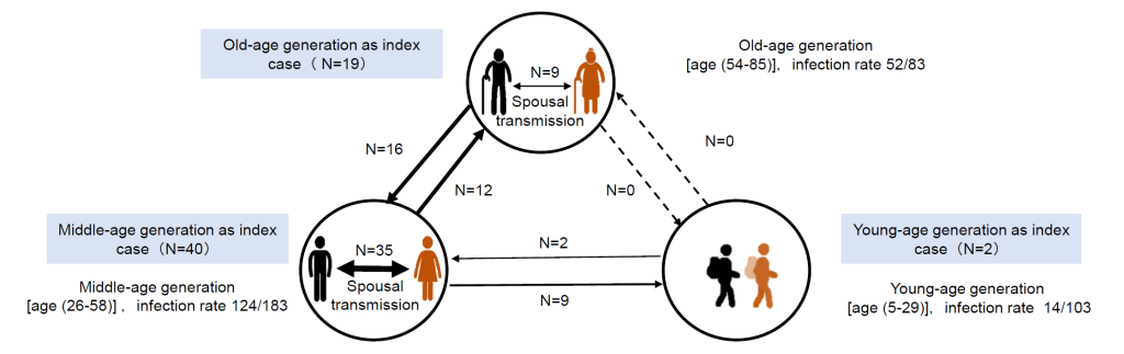Family transmission was defined as at least two members having confirmed SARS-Cov-2 infections in one family. Family transmission was determined by examining the relationship between index cases and other infected family members. According to age and marriage status, family members were divided into the young-age generation, middle-age generation and old-age generation group. Considering that some family members presented with an onset of illness at the same time, we could not identify the index cases and therefore used the house effect rate rather than the second infection rate. The household effect rate was calculated as the ratio of infected family members to total family members. The index case was the family member who presented with symptoms at the earliest time and had a final confirmed diagnosis. When two or more cases showed symptoms at the same time, the index case could not be confirmed.